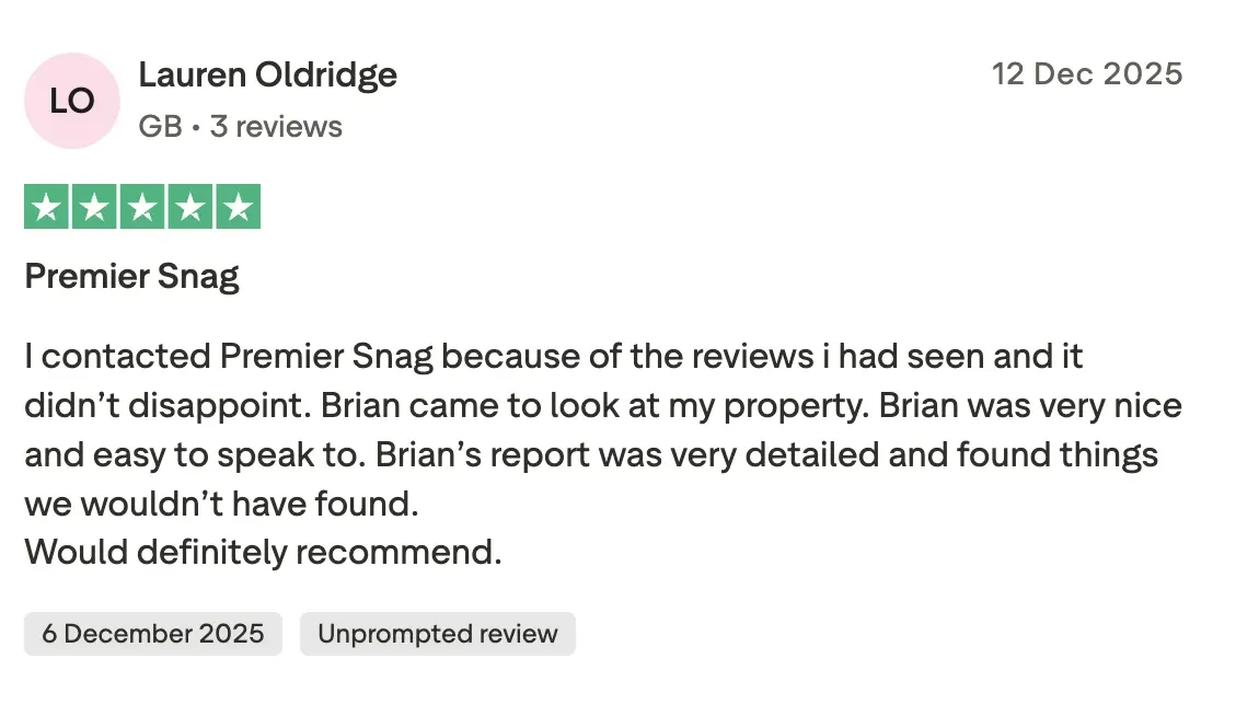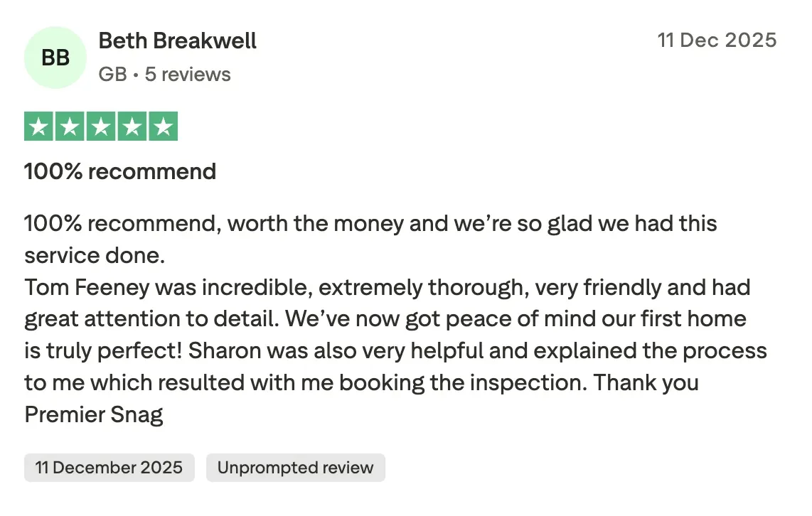 5 stars on Trust Pilot, over 15,000 homeowners helped across the UK. Fully insured, highly experienced & qualified independent snagging Inspectors.